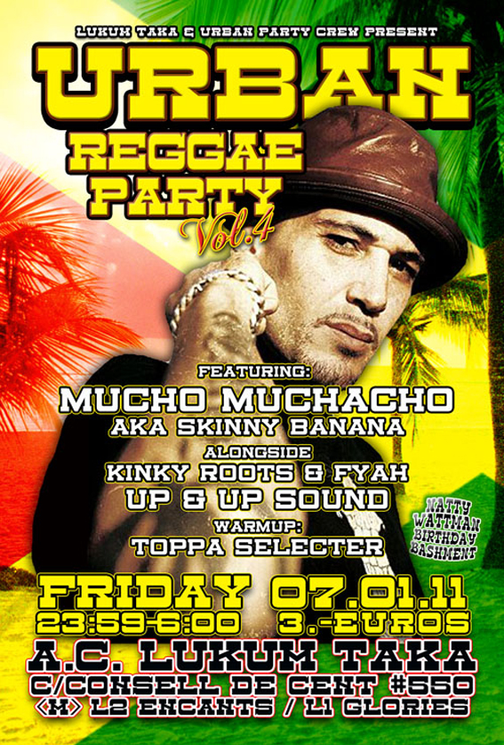 Nueva cita en el A.C. Lukum Taka con Mucho Muchacho Aka Skinny Banana, Kiny Roots & Fyah, Up N Up Sound, Sburio, Soggetto, Natty Wattman y Toppa Selektah.