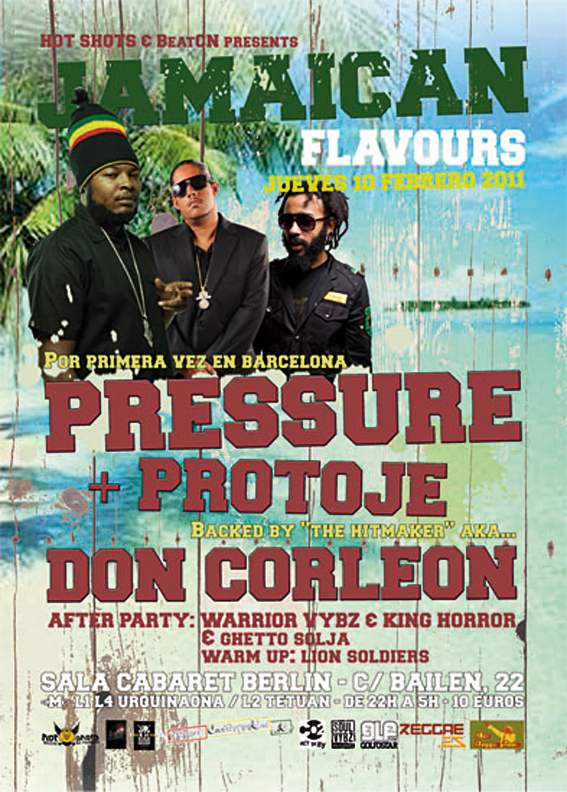 «El próximo jueves 10 de Febrero 2011 llegan a Barcelona aromas jamaicanos de primer nivel. De la mano de Hot Shots y de BeatCN Barcelona se viste de gala para recibir a uno de los más grandes productores de reggae y dancehall de los últimos tiempos llamado Don Corleon que vendrá acompañado de otro gran artista de primerísima línea y que firma continuamente exquisitos temas, se trata del gran Pressure. Para la ocasión también les acompañará un upcoming artist llamado Protoje que promete ofrecer un interesante show.»