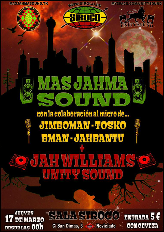 «La sala Siroco, dentro de su programación de todos los jueves dedicada a los sound systems y selektahs, volverá a reunir a dos de los máximos exponentes del nu-roots en la ciudad: Mas Jahma Sound y Jah Williams (Unity Sound), y para esta ocasión tan especial contará con la participacion de Jimboman, Tosko, B-Man Zerowan y Jah Bantu.