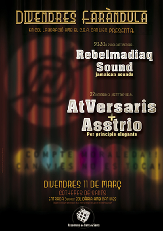 «Rebelmadiaq Sound vuelve a la carga este viernes 11 de Marzo, y lo hace para una ocasión muy especial. Can Vies, Centro Social Autogestionado de Sants, punto neurálgico del tejido asociativo del barrio, se encuentra en mitad de un proceso judicial para ser desalojado después de 14 años de vida. Es por eso que la Assamblea de Barri de Sants y Can Vies organizan un concierto solidario en defensa de este espacio popular y contracultural.»