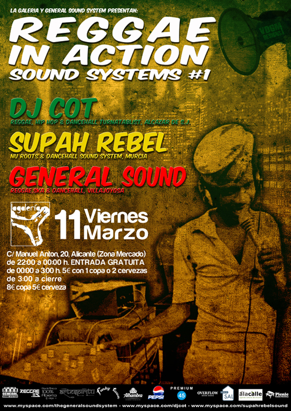 «La Galería y presentan Reggae in action: sound systems #1, fiesta mensual que se realizará en La Galería (c/ Manuel Anton, 20, Alicante, Zona Mercado), donde se recorrerán los sonidos roots, dub, ska, nu roots, hip hop, y jungle.»