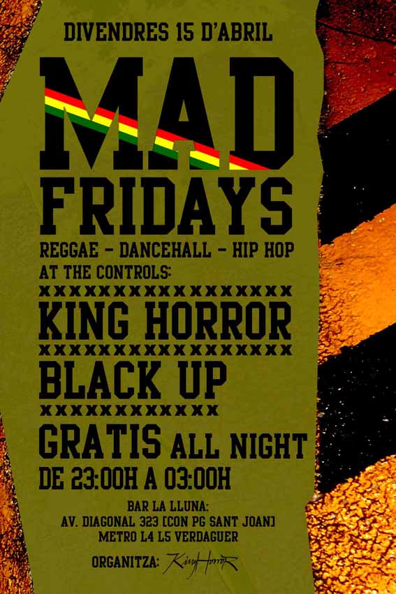 «Ultimamente las reggae partys no dan tregua en la ciudad condal, y este fin de semana no va a ser una excepción. Así que después del gran éxito de la primera edición de Mad Saturdays, King Horror vuelve a la carga, pero en viernes (Mad Fridays). Para esta ocasión también tendremos a los platos a Black Up.»