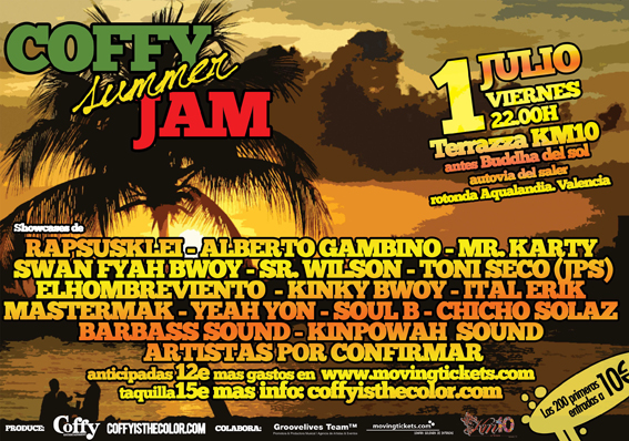 «El primer viernes de Julio tendrá lugar la Coffy Summer Jam, la fiesta que dará pistoletazo de salida al verano y que tendrá como ingrediente principal lo más granado del panorama nacional en cuanto a reggae y a hip hop. Artistas que no solo triunfan dentro de nuestras fronteras sino también en el extranjero y que se reunirán en la Terrazza KM 10 (antigua discoteca Buddah del Sol) para ofrecer una de las fiestas más esperadas de principio de verano.»