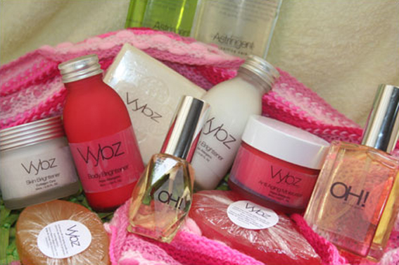 La linea de productos incluye: Vybz Body Brightener, Vybz Skin Brightener, Vybz Anti-Aging Moisturizer, Vybz Gentle Soap y el perfume Oh!