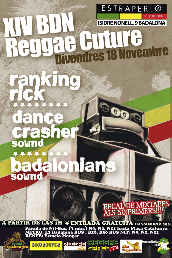 El próximo viernes 18 de Noviembre a partir de las 1h hasta la 6:00, XIV edición de la fiesta Bdn Reggae Culture en la sala Estraperlo. Esta vez como invitado tendremos a Ranking Rick a los platos, junto a los residentes Dance Crasher Sound y Badalonians Sound. Stricly vinyl selection!