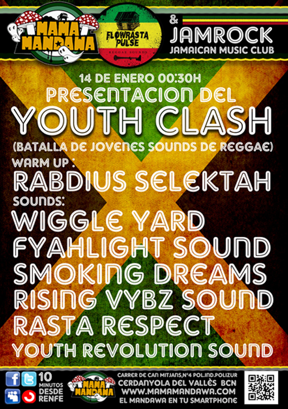 «Sábado 14 de Enero 2012 en la sala Mama Mandawa con Flow Rasta Pulse junto a Youth Revolution Sound y con la participación especial de Jamrock Crew os invitan a la presentación del Youth Clash.»