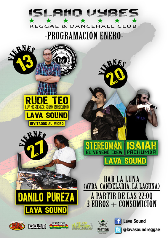 «A partir de Enero de 2012, Lava Sound convertirá todos los viernes el Bar la Luna en Island Vybes Reggae Dancehall Club. Un lugar donde escuchar y bailar música jamaicana interpretada por los principales artistas de la escena en Canarias, ya sean selectores, grupos o cantantes; y también con algunos invitados especiales de fuera del archipiélago.»