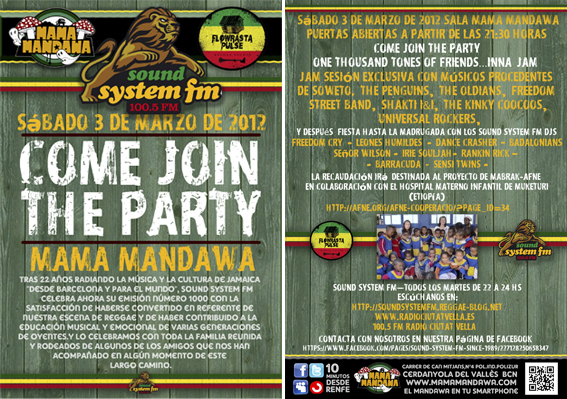 «Tras 22 años radiando la música y la cultura de Jamaica desde Barcelona y para el mundo, Sound System Fm celebra ahora su emisión número 1000 con la satisfacción de haberse convertido en referente de nuestra escena de reggae y de haber contribuido a la educación musical y emocional de varias generaciones de oyentes. Y lo celebramos con toda la familia reunida y rodeados de algunos de los amigos que nos han acompañado en algún momento de este largo camino.»