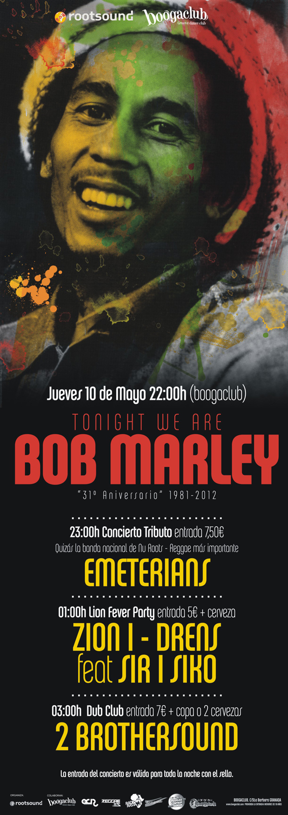 “El próximo jueves 10 de Mayo en la Sala Boogaclub de Granada llega tonight we are Marley, con esta suculenta programación.”