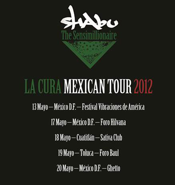 «En el punto más álgido de su carrera, Shabu cruzará el charco de nuevo, esta vez para realizar su primer gira por México acompañado de Dj Pionear (Germaica Digital), destacando la actuación que realizarán el próximo 13 mayo en México DF en el Festival Vibraciones de América en su treceava edición. Dicho festival en su larga trayectoria ha contado con grandes nombres de la escena Reggae internacional como son Anthony B, Cocoa Tea o Junior Kelly.»