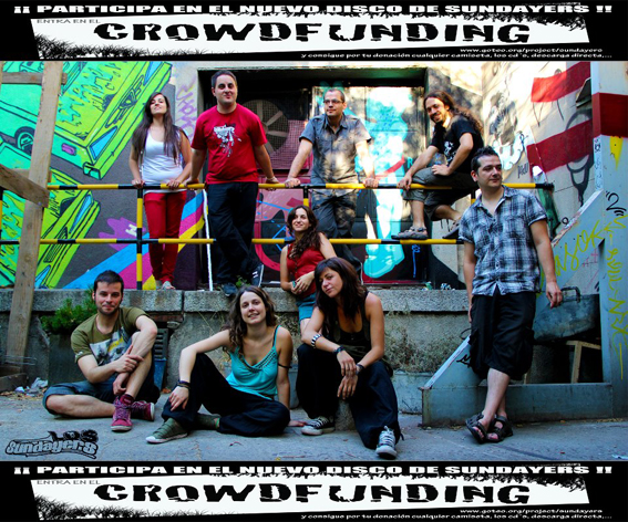 «El crowdfunding se produce cuando una multitud o grupo de personas, crowd, decide apoyar un proyecto financiándolo, funding. Sundayers ha optado por la plataforma Goteo. Su objetivo es conseguir la financiación necesaria para grabar y editar un disco a través de la venta por anticipado del mismo y de distintas recompensas (entradas, camisetas, etc.).»