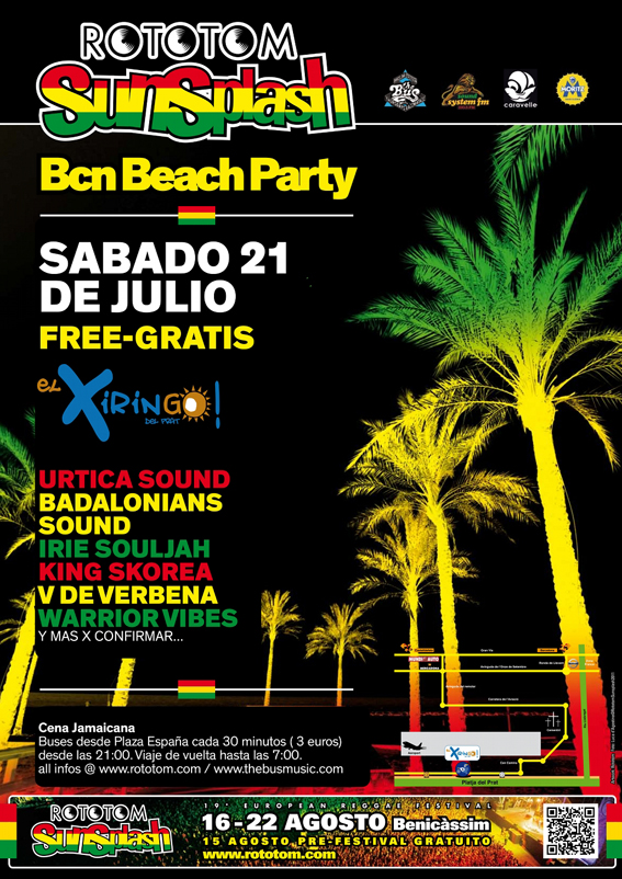«Con la llegada del calor, The Bus Music y Sunsplash organizan, en el Xiringo de la playa del Prat el Sábado 21 de Julio, una noche dedicada a la cultura jamaicana bajo un marco incomparable: playa, la luna sobre el mar y el rojo de Clear Sound que tanto hace vibrar a la gente ultimamente, y un cartel de lujo inmejorable para amantes del reggae, dancehall y la cultura sound system.»