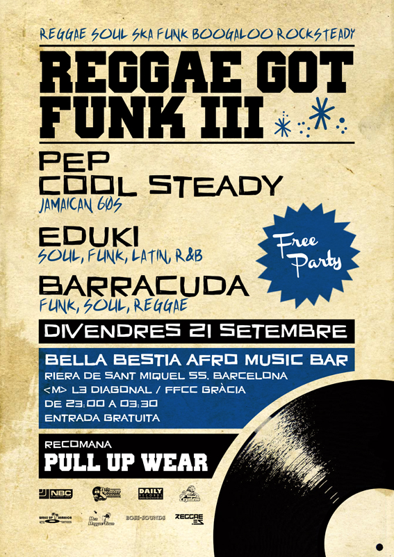 «Una combinación de soul, reggae, boogaloo, rocksteady, funk, ska… La mejor música caribeña y afroamericana tomará el control del Bella Bestia Afro Music Bar de Barcelona esta noche con Pep Cool Steady (Jamaican 60s), Eduki (Funk, Latin, Soul, R&B) y Barracuda (Funk, Soul, Reggae).»