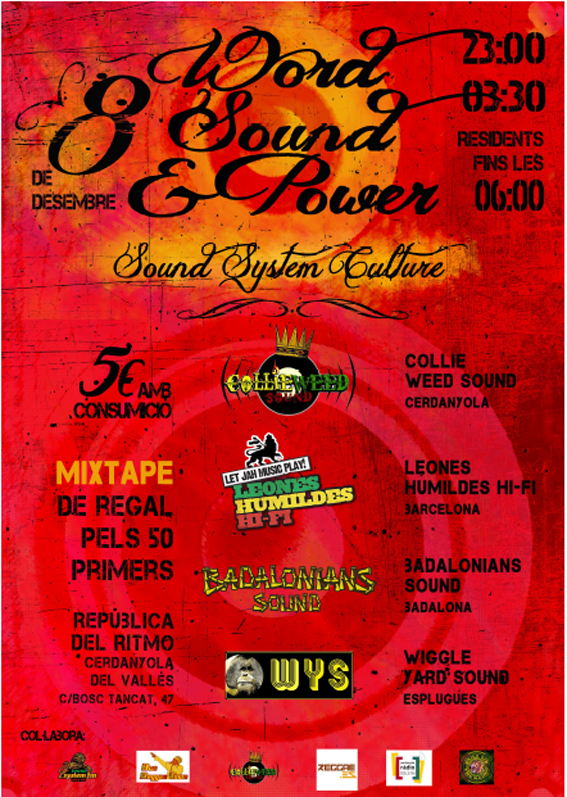 El 8 de Diciembre, Word, Sound & Power, en la sala Republica del Ritmo (Rep del Ritmo) con Leones Humildes Hi-Fi, feat. Irie Souljah, Sound y Collie Weed Sound. Sound system 100 % vinyl.