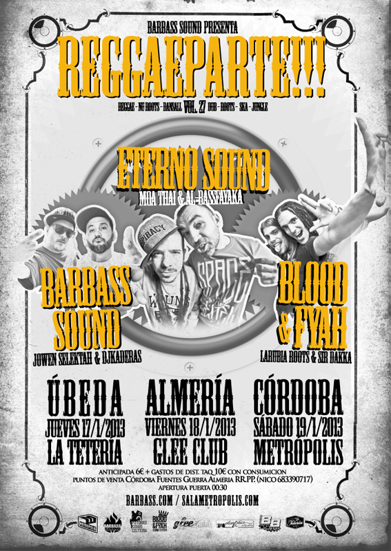 En esta ocasión le toca el turno a Úbeda, Almería y Córdoba y contará con la presencia de dos sounds cordobeses: Blood and Fyah Sound y Barbass Sound llenos de dubplates y con los mejores meddleys de riddims. Desde Zaragoza estarán presentes Eterno Sound, nuevos en nombre y veteranos en escena. Alfonsound como Al-Bassfayaka y Rapsusklei en su faceta de selector como Moa Thai.