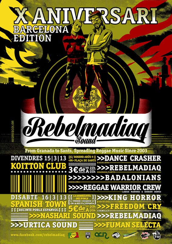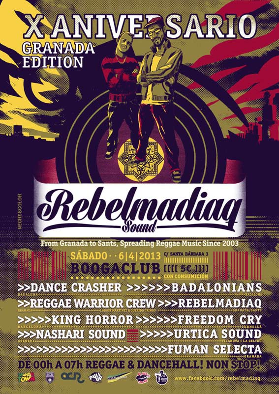 La música dice lo que no se deja decir de otra manera, es la vida misma cuando se mueve. Más allá del culto a la ganja, más allá de los discursos bíblicos que expresan una particular mística de la liberación, más allá del daggering y más allá de las producciones hype del momento, el reggae, con la pequeña isla de Jamaica como fundadora, creadora y experimentadora del género, sigue siendo música de movimiento, pues en su origen esta hecha para llegar al corazón y sacudir las emociones. Como sacudió las suyas hace años aquí, al otro lado del charco. Así que, Rebelmadiaq, un andaluz y un catalán, quieren celebrar que tuvieron la suerte de encontrar esta música y que esta música los encontrara y que hace diez años que se mueven juntos seleccionándola, pinchándola y presentándola ‘inna sound system style’, aportando así su pequeño grano de arena a esta extensa cultura.