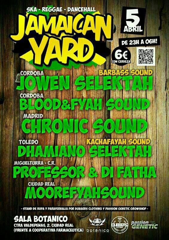 Después de dos exitosas fiestas en Ciudad Real, el próximo 5 de Abril, los chicos de Dubbers preparan la tercera; Jamaican Yard pretende acercar los ritmos jamaicanos a Ciudad Real ocupando todos los estilos, desde el Roots, pasando por el New Roots, el Dancehall o el Ska y Rocksteady con nombres tan conocidos como Jowen Selektah, Dhamiano Selektah (Kachafayah), Chronic Sound o Blood & Fyah. Sin duda es una fecha para venir a conocer el sonido de la Isla del Tesoro. La entrada cuesta 6 euros con cerveza. En Sala Botánico de 23h a 06h.