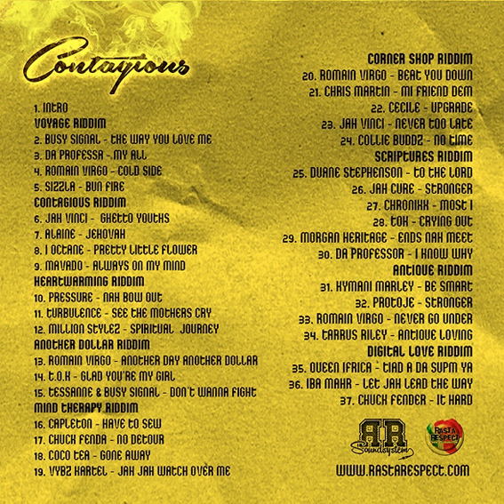 A pocos meses de llegar el verano, este mes de Abril, Rasta Respect Sound saca su esperada primera mixtape. “Contagious” es el nombre para este primer trabajo de 47 minutos de duración Esta edición es exclusivamente de new roots y nos transporta a Jamaica con la últimas novedades de este 2013.