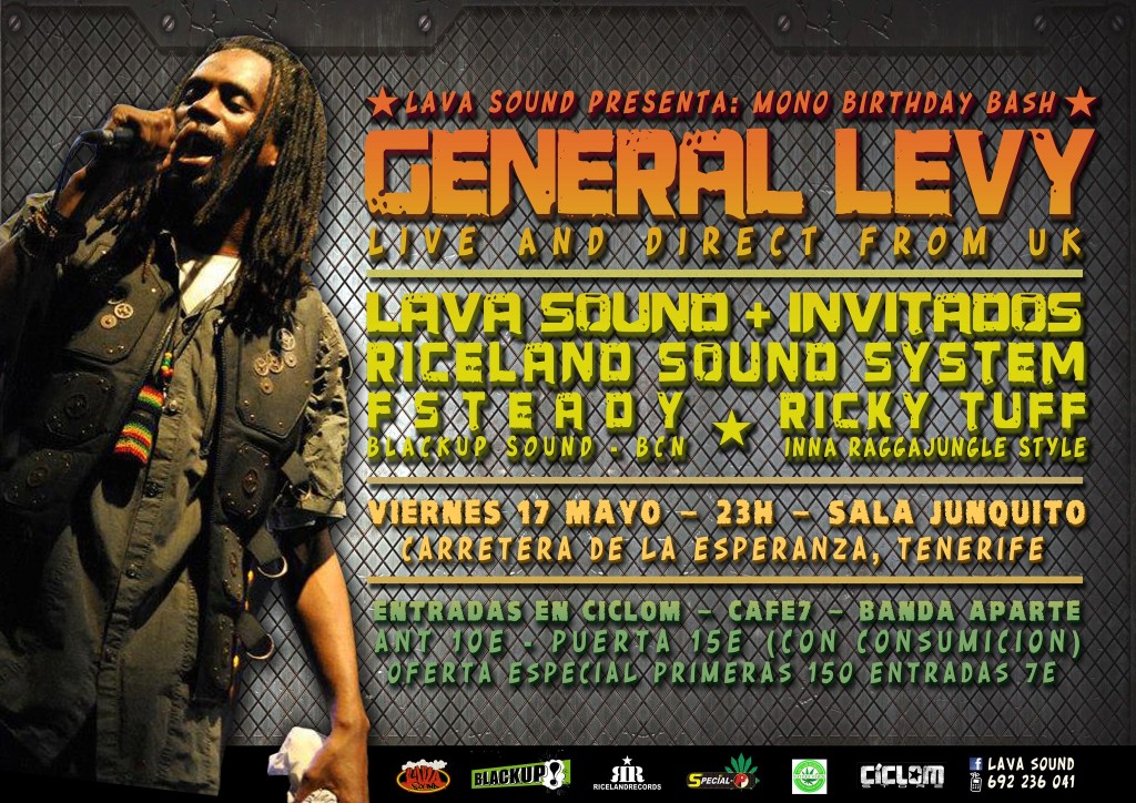 Los Tinerfeños deben estar de enhorabuena, el poderoso show de General Levy se va acercando, con motivo del cumpleaños de Mono, Lava Sound prepara una gran celebración trayendo a la isla al artista londinense. Para quien no lo conozca General Levy nació en Londres en la década de los 70, y en 1994 firmó su primer gran éxito con el tema ‘Incredible’ en colaboración con el importante productor británico M. Beat (la canción fue incluida posteriormente en la banda sonora de la película Ali G, alcanzo cotas aun mayores). A partir de ese momento las puertas de las grandes productoras se abrirían para General Levy, firmando discos y colaboraciones con importantes productores como King Jammys, y convirtiéndose hoy en día en uno de los artistas más espectaculares a la hora del directo.