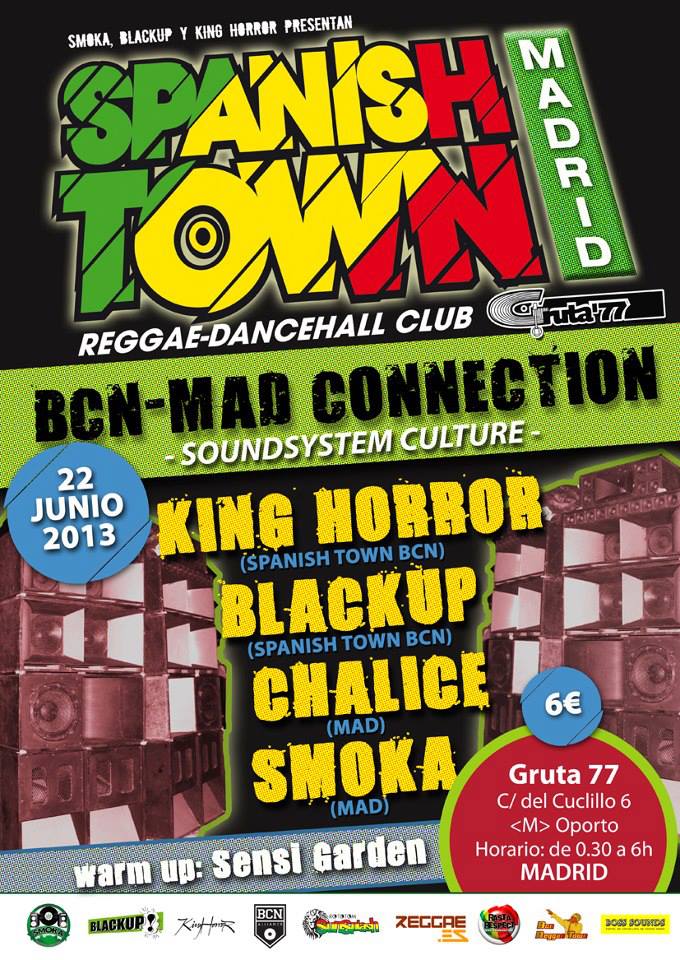 Spanish Town se traslada por una noche a la capital de España, la fiesta que habitualmente era acogida en la bodeguita del poble Espanyol (Barcelona) se mueve a madrid este fin de semana al Gruta 77 con la intención de hacer una BCN-Madrid Connection. Invitados, Chalice sound y smoka (Mad) y King Horror y Black up (BCN). El warm up corre a cargo de los Sensi Garden. Una noche completita a la que no puedes faltar
