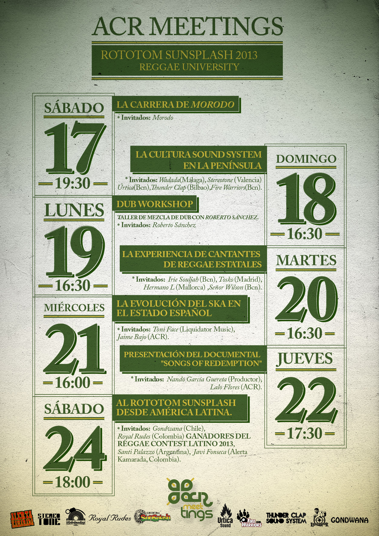 Los ACR Meetings se consolidan como la versión hispana de la Reggae University y contarán en sus sesiones con la presencia de destacados artistas de la escena reggae española y latinoamericana. Además podrás disfrutar de la presentación de películas y documentales de la mano de sus autores.