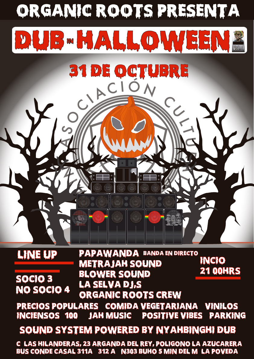 Nos preguntamos si las calabazas con cara de pesadilla, serán realmente Orgánicas, si el ambiente será terrorífico o si pasaremos una noche de auténtico miedo. Lo que tenemos más que claro es que el mejor lugar para celebrar la noche de Halloween, el próximo 31 de Octubre, es en la POVEDUB con la familia Organic Roots y su DUB- Halloween…estarán dando pánico: