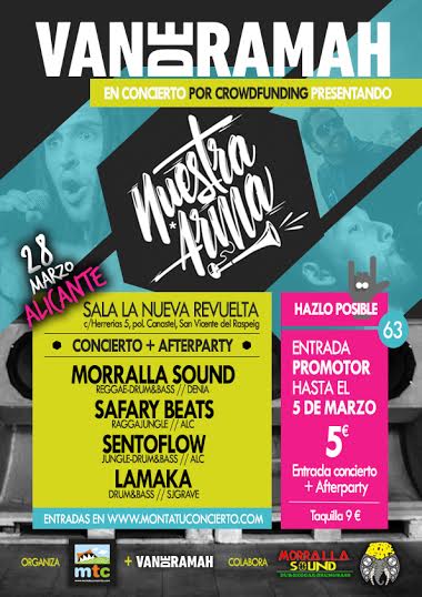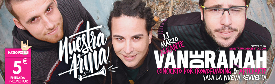 Van de Ramah presentan en Alicante el próximo 28 de Marzo en la Sala La Revuelta ( San Vicente del Raspeig) , su último disco ¨Nuestra Arma¨ , en un concierto organizado por crowdfunding con la plataforma montatuconcierto.com. Además tienen preparada una afterparty con la colaboración de Moralla Sound, Safary Beats, Sentoflow y Lamaka, diferentes soundsystems y djs que se suman a la presentación y le pondrán el broche final a la noche.