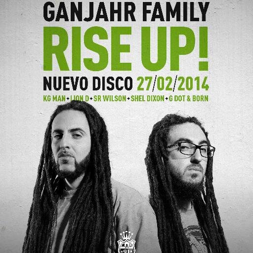 rise-up-ganjahrRISE UP! es el nombre del nuevo LP de GANJAHR FAMILY, consta de 15 canciones cargadas de mensaje consciente y ritmos pegadizos, en las que se incluyen colaboraciones de primer nivel como KG Man, Lion D, Sr Wilson, Shel Dixon y G Dot & Born. Las producciones corren a cargo de Sex & Sound, Mad Sensi Band, Records, Heavy Roots, P. Leyenda, Bizarry Records, Genis Trani y Roty 340.