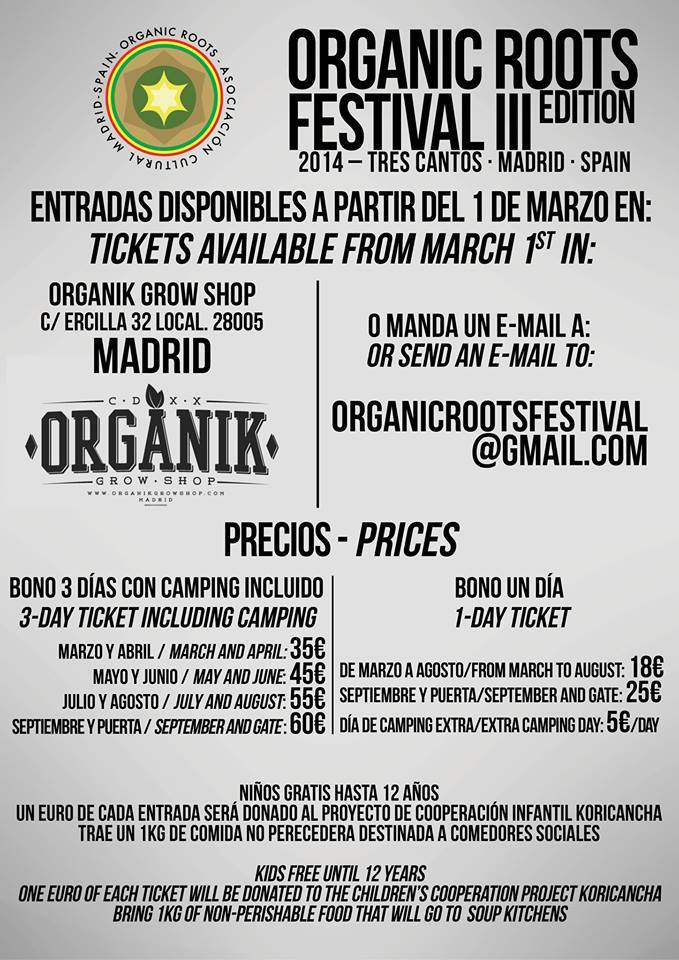 Puedes comprar tus entradas en Organik Grow Shop C/Ercilla 32 local (Madrid)o mandando un mail a organicrootsfestival@gmail.com