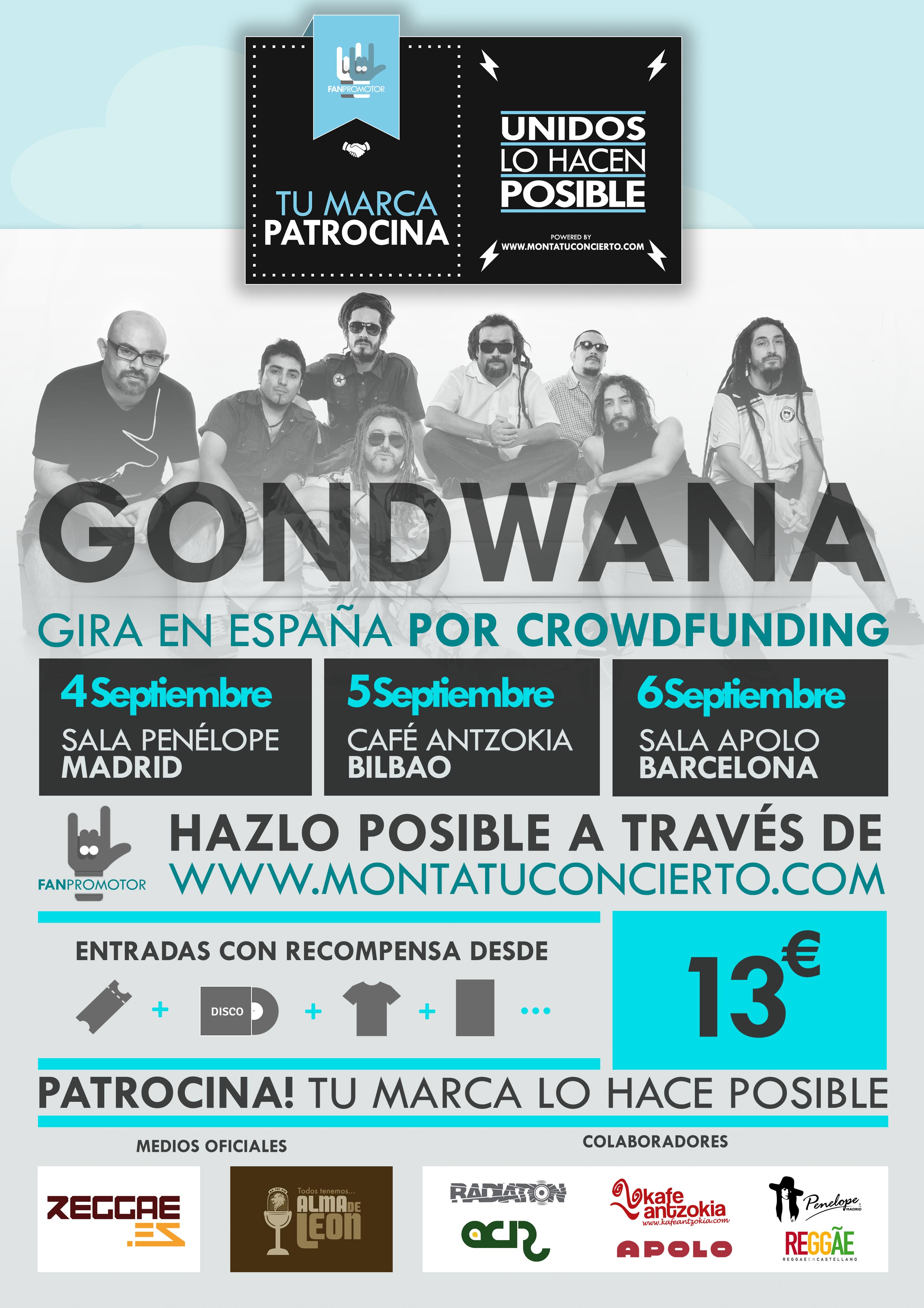 La mítica y emblemática banda Chilena GONDWANA, referente de la música Reggae latinoamericana, quiere montar su próxima gira por España a través de montatucocnierto.com, y para ello se unen a esta nueva forma de organización de Conciertos a través del Crowdfunding.