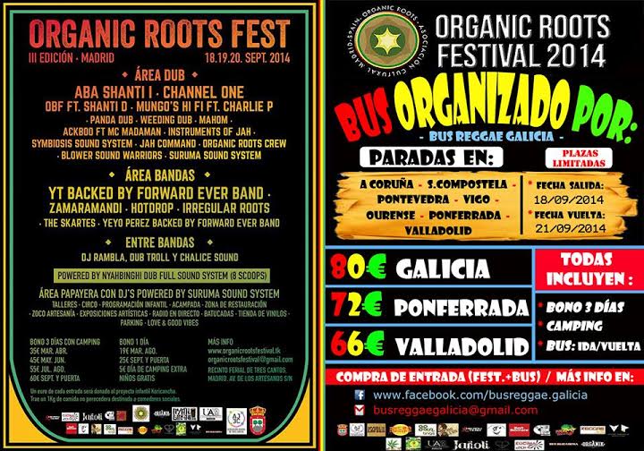 Bus Reggae Galicia organiza un viaje al Organic Roots Festival 2014,haciendo paradas en A Coruña, Santiago, Pontevedra, Vigo, Orense, Ponferrada y Valladolid ( en estas dos últimas tienen que tener un nº mínimo de personas). Propone un pack que incluye, bus ida/vuelta + entrada festival 3 días + camping aunque si ya tienes tu entrada, puedes coger solo bus (consultar precio). Las plazas son limitadas y ya hay gente que ha reservado la suya !.**DESTACAR QUE: Para que salga este precio tienes que comprarla a través de Bus Reggae Galicia.
