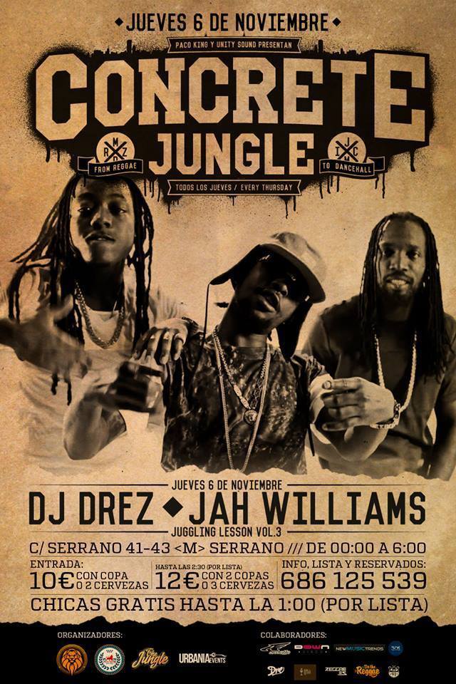 Tras el exitazo del pasado jueves en Siroco, en la fiesta de despedida de Jah Williams de este mítico lugar, reducto reggae de Madrid en las noches de Jueves. Comienza el nuevo ciclo y ese centro neurálgico jamaicano se desplaza a The Jungle Sessions, y en concreto “Concrete Jungle” será la fiesta por excelencia en las noches de reggae de la capital, comenzando este mismo jueves 6 de Noviembre con Dj Drez de Kachafayah y con Jah Williams de Unity Sound, quiénes protagonizarán la tercera entrega de sus “Juggling Lessons”.