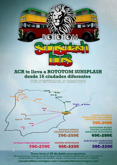 Desde la Asociación Cultural Reggae hemos puesto en marcha un servicio de autobuses desde varias ciudades que saldrán el 14 de agosto hacia el recinto del Rototom Sunsplash en Benicassim y llevará de vuelta a los pasajeros desde allí a sus ciudades el día 23 de agosto.