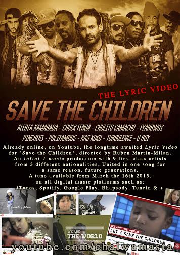 Ya está online el esperado Lyric Video de «Save the Children», dirigido por Ruben Martin-Milan, una producción de Infini-T music con 9 artistas de primer nivel internacional, 3 nacionalidades:Alerta Kamarada (Col), Chuck Fenda (Jam), Chulito Camacho (Esp), Fyahbwoy (Esp), Pinchers (Jam), Polyfamous (Jam), Ras Kuko (Esp), Turbulence (Jam) & U Roy (Jam).