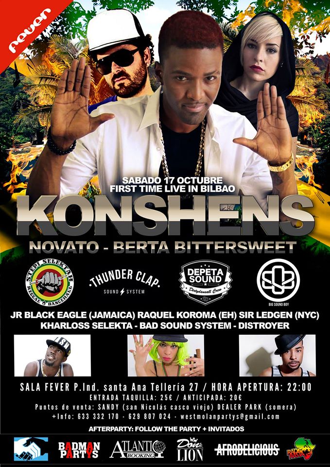 Durante la noche además del artista jamaicano Konshens tendremos al micro a Novato y a Berta Bittersweet. Los encargados de poner el sonido son: Bad Sound System, Thunder Clap Sound System, Depeta Sound DirtyHall Crew, Big Sound Boy, Kharloss Selektah y Distroyer. Ademas los dancers Jr Black Eagle, Raquel Koroma y Sir Ledgen.