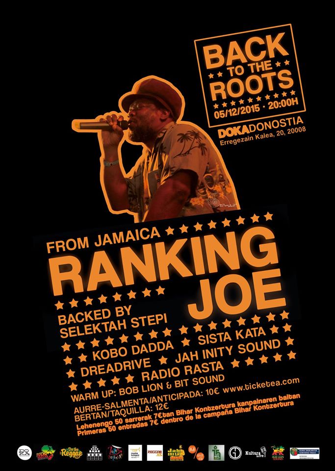 Desde Jamaica llegará Ranking Joe a Donosti el próximo 5 de diciembre. Backed by Selektah Stepi, el artista ofrecerá un concierto en la Sala Doka a partir de las 20 horas. Después de su actuación continuará la fiesta con Kobo Dadda, Sista Kata, Dreadrive, Jah Inity Sound y Radio Rasta.