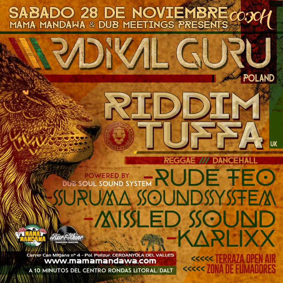 El sábado 28 de noviembre a partir de las 23.45 horas hay fiesta dub/reggae/dancehall en Mama Mandawa (Cerdanyola del Vallés, Barcelona). Los invitados son Radikal Guru (Poland), Ridim Tuffa (UK), Dub Soul Sound System, Rude Teo, Suruma SoundSystem, Missled Sound y Karlixx.