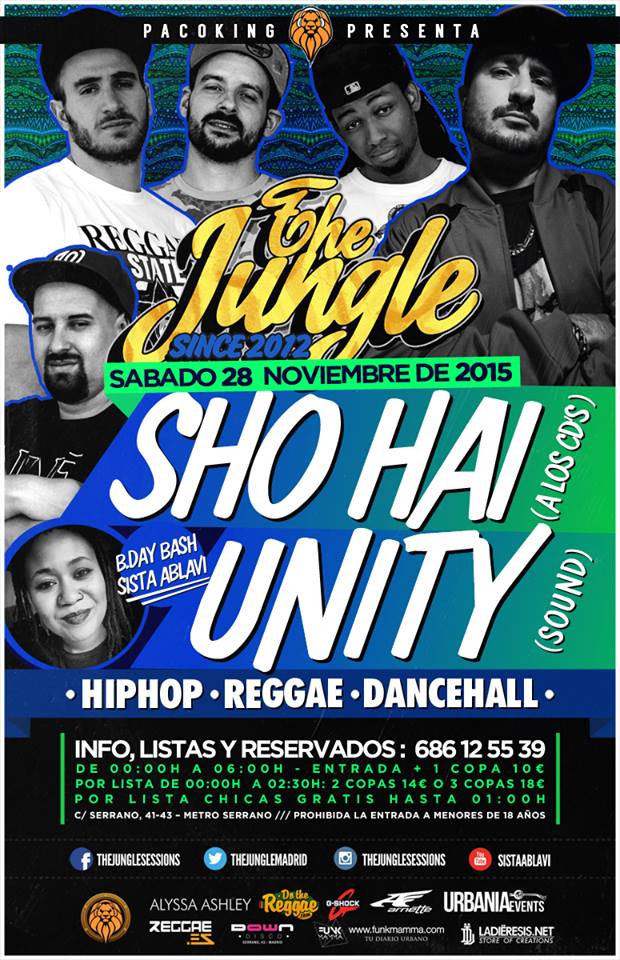 Desde Madrid y Zaragoza vienen invitados para una noche especial, el cumple de Sista Ablavi, una de las gerentes de The Jungle Sessions!! Sho Hai y Unity Sound estarán este sábado para festejarlo con sus sesiones de Hip Hop y música jamaicana.