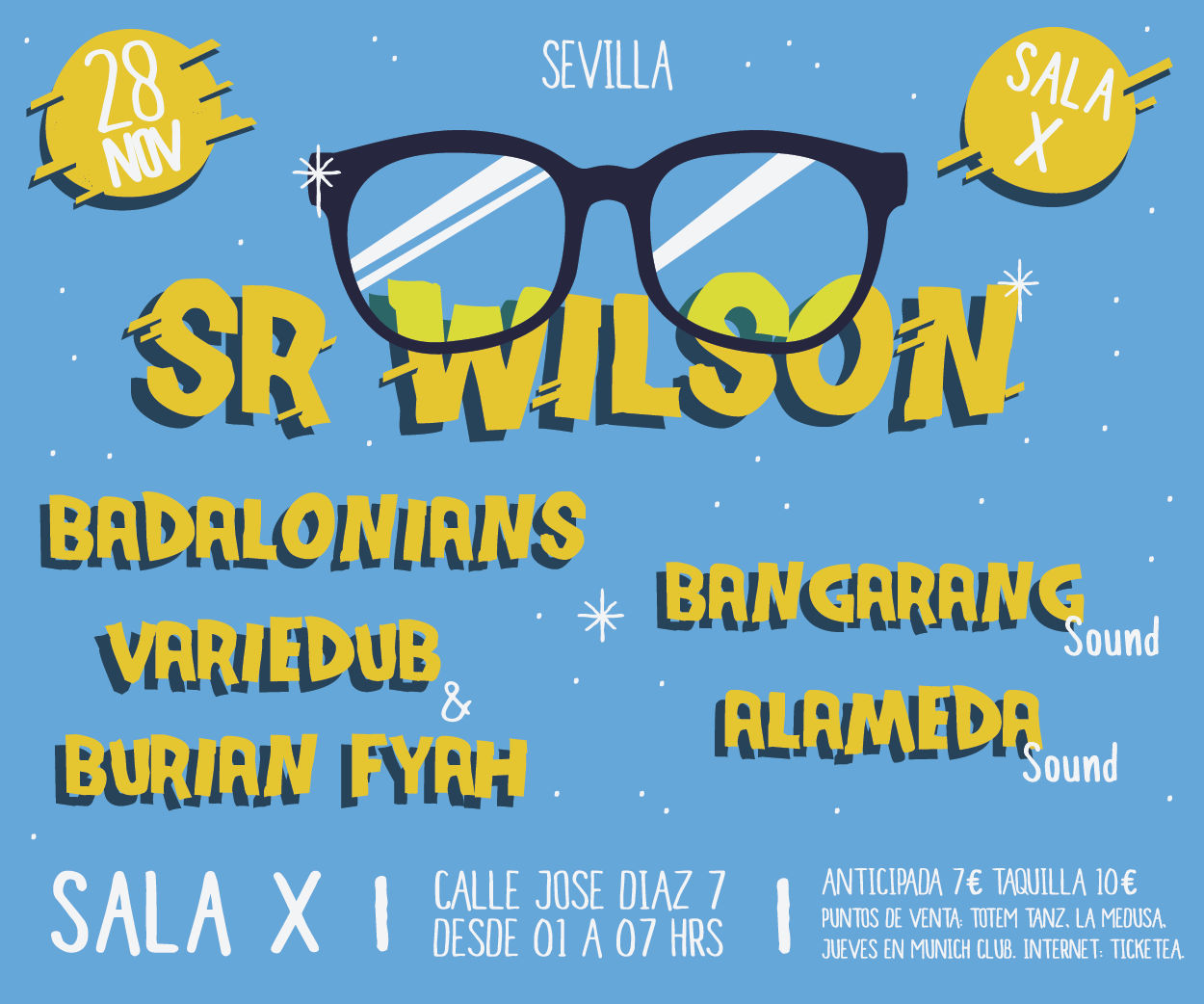 Sr. Wilson estará el próximo 28 de noviembre en la Sala X de Sevilla. Y no estará solo, la acompañarán esta noche tan especial Badalonians, Variedub & Burian Fyah, Bangarang Sound y Alameda Sound.