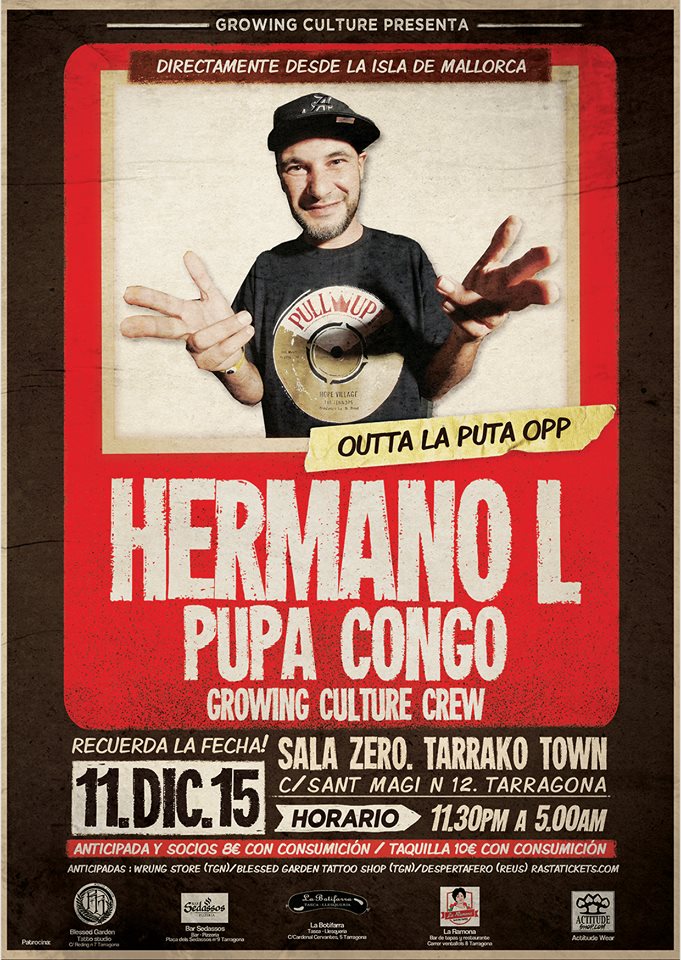 Hermano L, miembro de la mítica formación de hip hop-ragga La Puta Opepé y con más de 20 años en los escenarios, estará por primera vez en solitario en Tarragona ofreciendo un auténtico espectáculo de reggae, hip hop y dancehall. Le acompañará con un show sin precedentes el gran Pupa Congo. Natural de Valencia, será la sorpresa de la noche. Co-fundador de Walk a Tone el año 2010, lleva más de 20 años participando en la escena reggae. Además, los sound’s y selectors de Growing Culture serán los encargados de amenizar la noche con sus mejores sesiones!