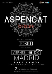 Los valencianos Aspencat continúan su gira presentación de su nuevo album, “Tot és Ara” La cita del día 18, en Madrid tiene un invitado muy especial el cantante Tosko quien nos ofrecerá uno de sus potentes shows a modo de Showcase recordando viejos temas y los de su reciente álbum. Ambos, banda y artistas son un referente en el reggae y Dancehall de nuestra actual escena.Todo esto en la sala Lemon de Madrid el próximo 18 de Diciembre.