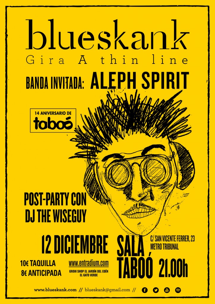 Vuelve Blueskank a Madrid, esta vez para despedir el año junto a Aleph Spirit, dentro de la programación del 14 aniversario de la Sala Taboo. Será el próximo sábado 12 de diciembre a partir de las 21:00.