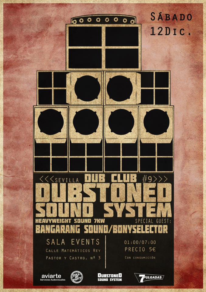Dubstoned vuelve a sacar su poderoso equipo de sonido para organizar la edición número 9 de Dub club Sevilla y esta vez acompañados de los 2 promotores de reggae más importantes que ha tenido la ciudad en la última década como son Bangarang Sound ( 7pulgadas radio show) y Bony Selector (reggae vibes Sevilla).
