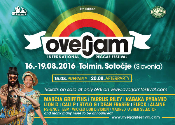 Tarrus Riley, Marcia Griffiths, Kabaka Pyramid, Cali P, Dean Fraser, Alaine, Stylo G, I-Shence, Fleck, Lion D, Madred, Asher Selector,  y Wicked Dub Division son los primeros nombres confirmados para el quinto Overjam International , que se celebrará en Tolmin (Eslovenia) del 16 al 19 de agosto. Estas primeras confirmaciones son una buena muestra del alto nivel del cartel de este año, que incluye tanto nombres históricos, como jóvenes de primer nivel internacional.