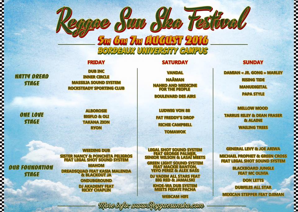 Este año traen tres escenarios y un cartel de infarto que incluye a artistas como Damián Marley, Inner Circle, Alborosie, Takana Zion, Tarrus Riley, Wailing Trees, General Levy, Joe Ariwa, Dreadsquad y muchos más. Del 5 al 7 de Agosto en el campus universitario de Burdeos.