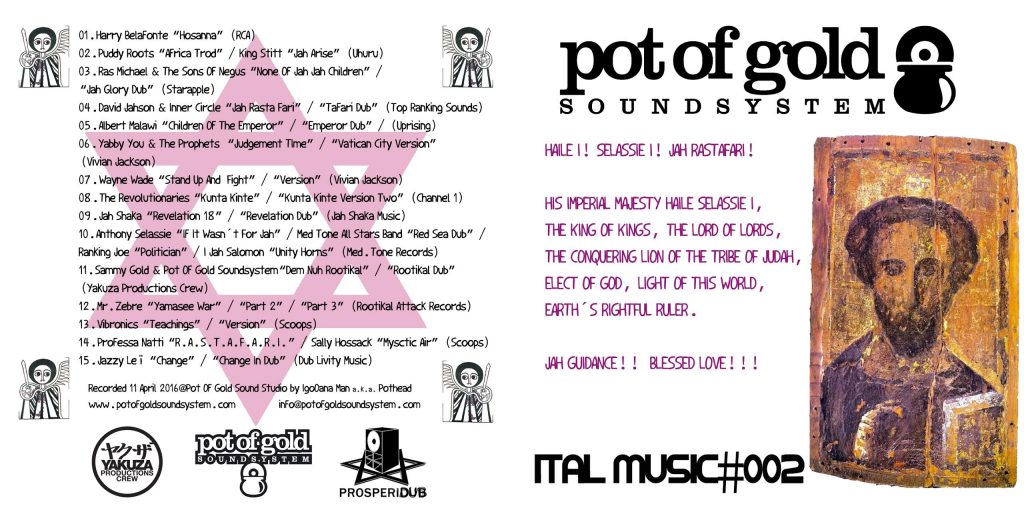 PotOfGold4Pot of Gold Soundsystem vuelve a la carga con la segunda entrega de su serie de mixtapes «Ital Music», cuya temática es el Rastafarismo y las buenas vibraciones. Grabada el pasado lunes 11 de Abril en Pot Of Gold SoundStudio.