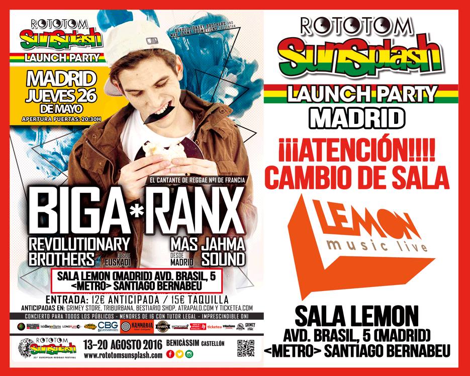 Atención, el concierto de Biga Ranx que estaba previsto se celebrase en la sala Penélope de Madrid cambia de sala en el último momento. Ahora será la sala Lemon (Avda. Brasil nº 5 la que acoja el Show. El evento se realizará con los mismos artistas y horarios.