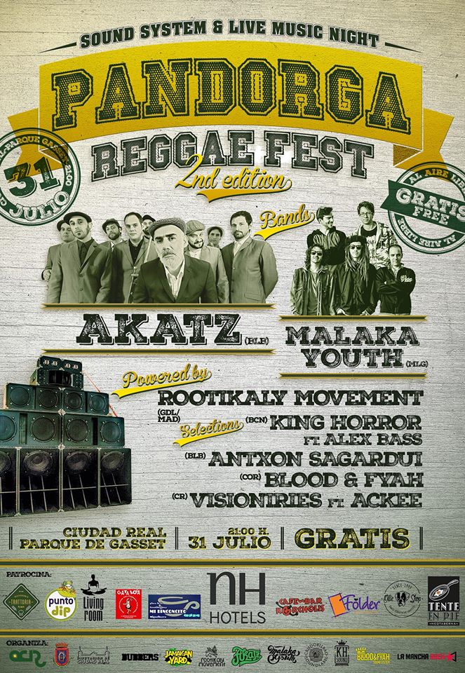 Después de un año duro lleno de curro apoyando la escena, creemos que nos merecemos pegarnos una buena fiesta…EN NUESTRA CIUDAD y es que la Asociación Cultural Reggae llevamos meses organizando la segunda edición del Pandorga Reggae Festival. Hemos convertido el día grande de Ciudad Real en un fiestón de música reggae, nuestra particular dosis de vibraciones jamaicanas!! con Akatz, Malaka Youth, Alex Bass Official, King Horror Sound, Antxon CrudoBilbao Sagardui, Blood & Fyah Sound, Visioniries Ofjah, Ackee Singer y Rootikaly Movement Sound System poniendo su poderoso equipo!! Queremos celebrarlo con todos los que os queráis acercar a Ciudad Real la noche del 31 de Julio en la fuente de la talaverana del parque de Gasset..un espacio al aire libre UNICO!!