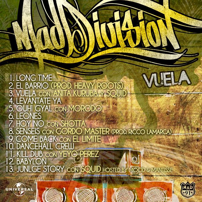 En un escueto mensaje desde Mad91 nos informanque el 28 de octubre estará disponible el nuevo trabajo de Mad Division «Vuela», con las colaboraciones de Morodo, Gordo Master, Shotta, El Limite, Yeyo Perez, Squid y Anita Kuruba (Canteca de Macao). También han colaborado Heavy Roots y Ricco LaMarca con un par de Riddims.El 22 de Septiembre estrenarán el primer adelanto «El Barrio» en formato videoclip. De momento ya podemos echar un vistazo a la carátula y al tracklist: