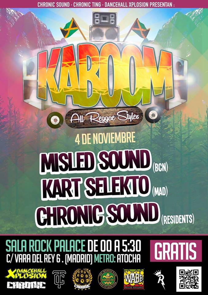 En Kaboom siempre tendremos selectores, sounds y dj’s o cantantes invitados, de manera que cada noche se repase practicamente toda la historia y estilos que abarca el Reggae. Desde Ska, Roots o Dub, al Dancehall mas moderno, sin olvida…r la decada Raggamuffin, Digital, Rub A Dub… al mas puro estilo Chronic Sound.